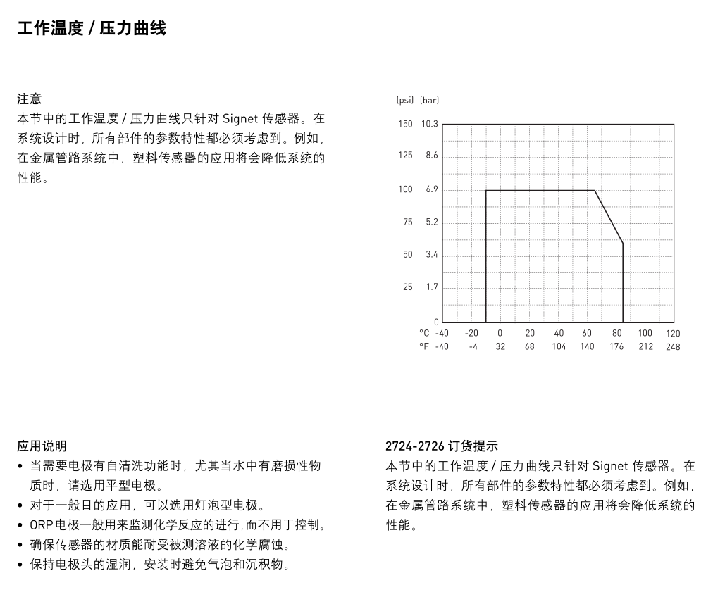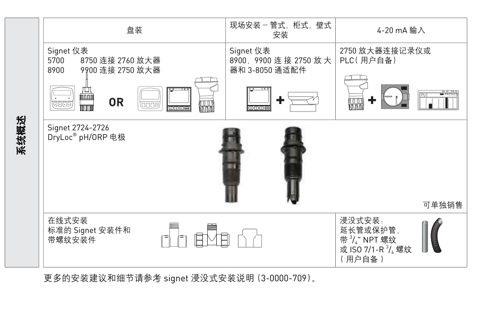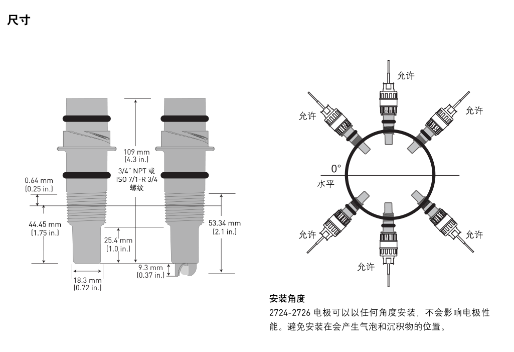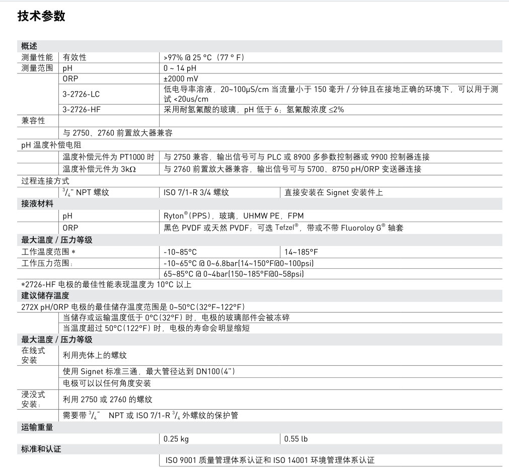 pH 電極的溫度補償電阻不論是 PT1000 還是 3kΩ,響應(yīng)時間都很快。這些電極都能與 Signet pH/ORP 儀表兼容。2724-2726 系列電極適合大范圍的普通目的應(yīng)用。 3 / 4 ”NPT 或 ISO 7/1-R? 3 / 4 連接螺紋可以方便地與標(biāo)準(zhǔn)三通安裝件連接。也可以直接安裝在標(biāo)準(zhǔn)的 Signet 安裝件上,DN15~100( 1 / 2 ~4”)。