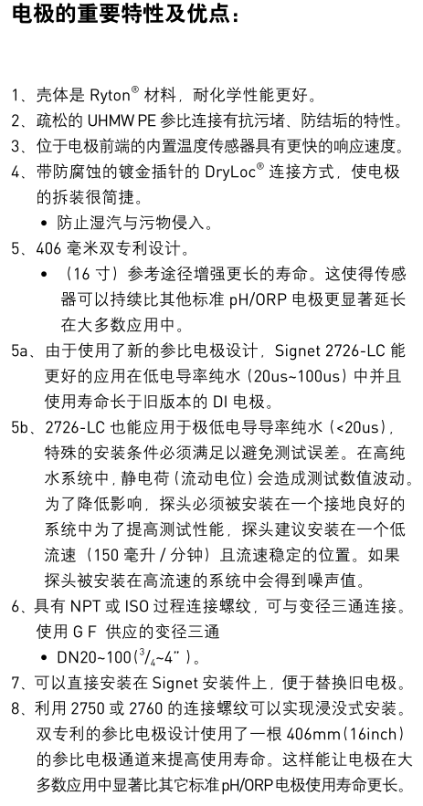 DryLoc ? 連接方式使用防腐蝕的鍍金插針,可以保證電極與 2760 或 2750 前置放大器牢固連接。pH 電極分為平型與燈泡型結(jié)構(gòu),ORP 電極為平型結(jié)構(gòu),并都帶有連接螺紋,殼體是堅固的 Ryton ? 材料,這些特點使得電極耐化學(xué)品范圍更寬,適合各種應(yīng)用。另外還提供 HF與 LC 兩種特殊 pH 電極供選用。HF 特殊 pH 電極用于含有少量氫氟酸 ( 濃度 ≤2%) 的溶液,標(biāo)準(zhǔn) pH 電極在這種溶液中會被侵蝕。LC 特殊 pH 電極用于低電導(dǎo)率溶液 ( 電導(dǎo)率在 20~100μS/cm)。如果安裝達(dá)到要求,也
