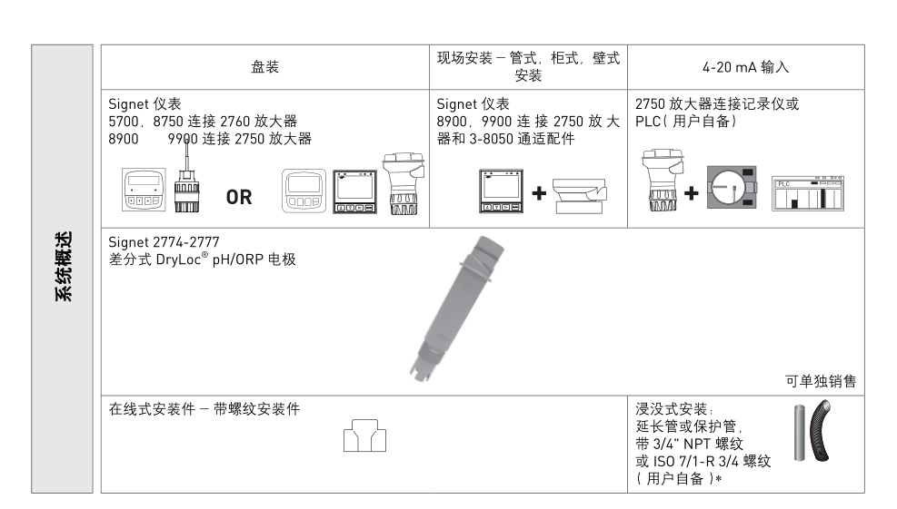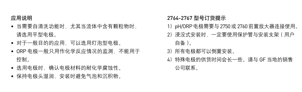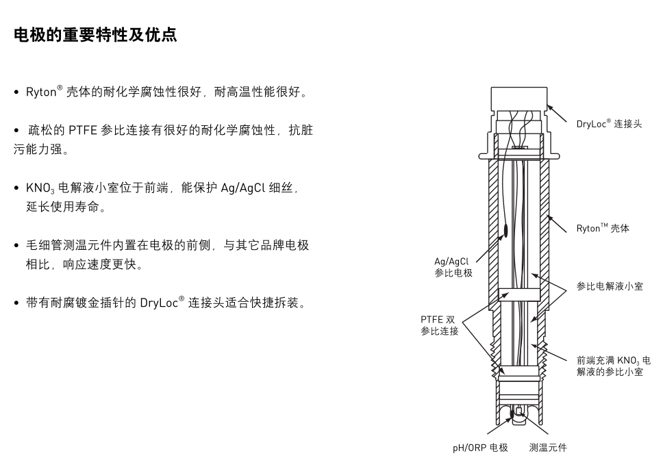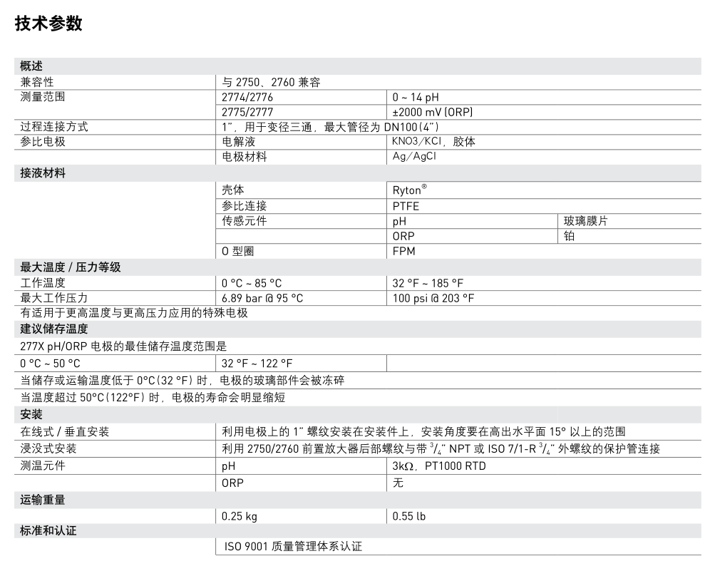 Signet 2774-2777 pH/ORP 電極有獨(dú)特的 DryLoc ? 連接方式,耐臟污,帶有鍍金插針,能與 2750、2760 前置放大器配用。此系列電極性能可靠,響應(yīng)速度迅速,PTFE 材料的雙參比連接設(shè)計(jì),含 KNO 3 電解液的前室可阻止像銅離子,鉛離子,汞離子等重金屬離子的進(jìn)入,大容量電解液小室能延長使用壽命。內(nèi)置在 pH/ORP 電極中的測(cè)溫元件能保證溫度響應(yīng)快速而精確。電極分為平型與燈泡型兩種。平型電極允許含有沉淀物或顆粒的溶液從傳感器表面流過,能防止玻璃被劃傷、擊碎或結(jié)垢。燈泡型電極適用于一般目的的應(yīng)用。由于電解液小室的特殊結(jié)構(gòu)設(shè)計(jì),使電解液能完全充滿,因此所有電極的安裝角度不受限,甚至可以倒置安裝。